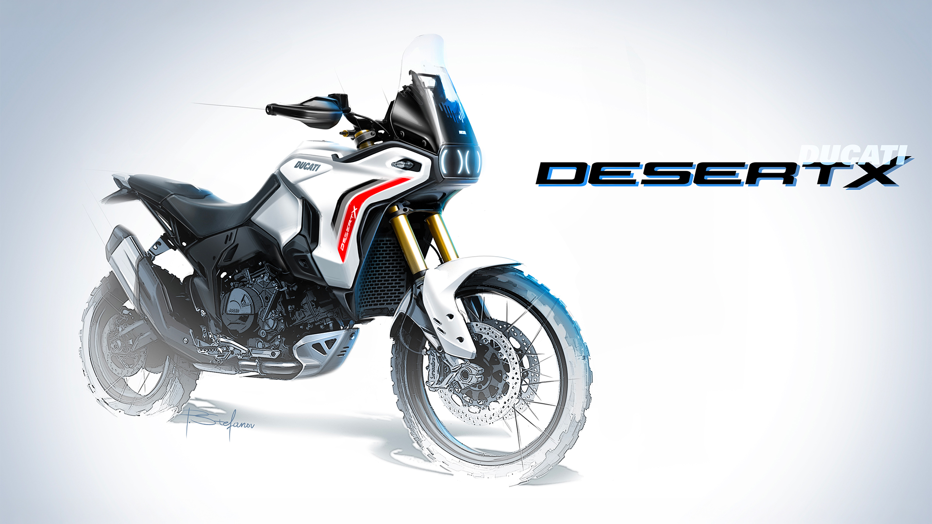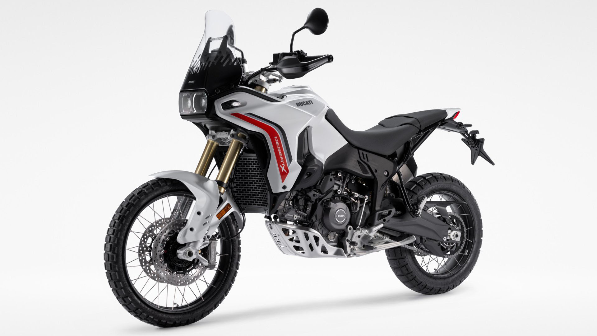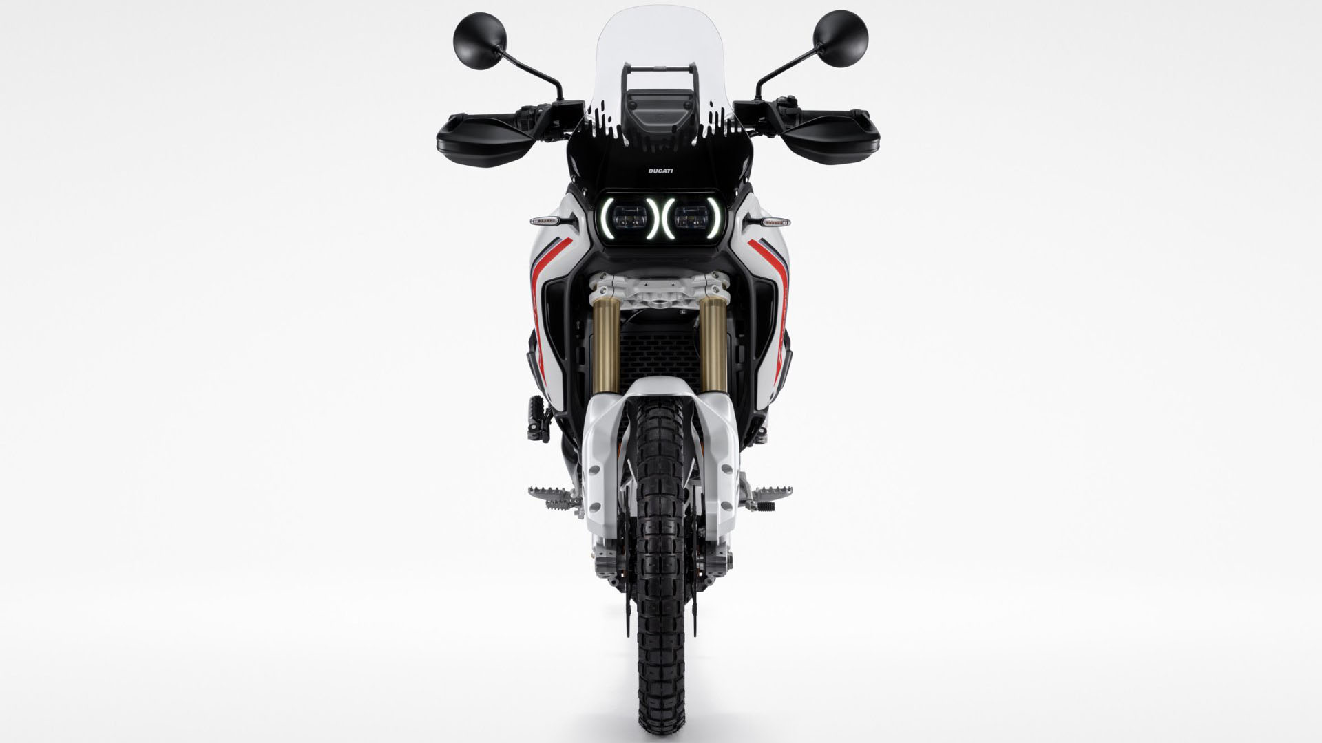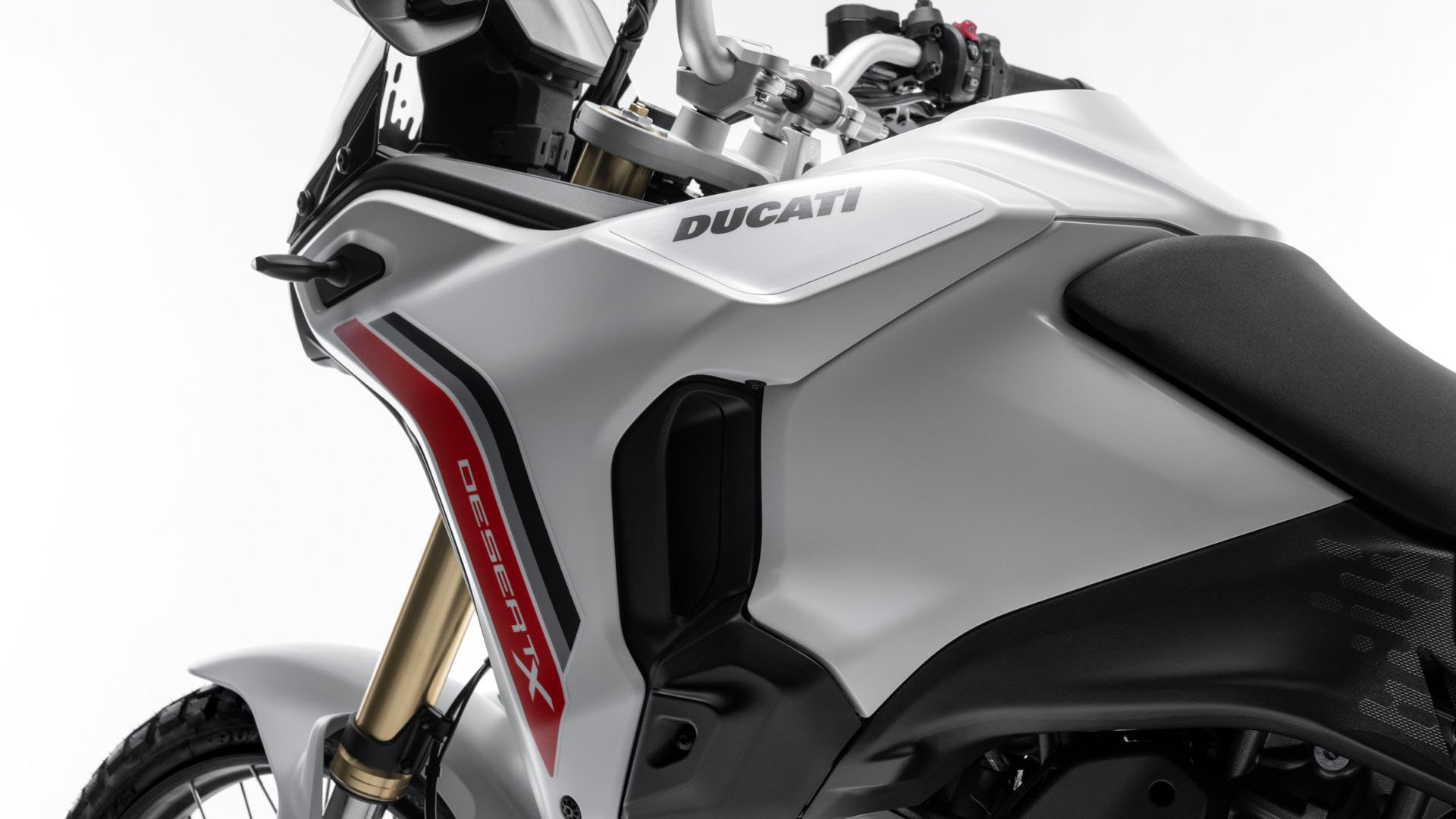 Με την πρώτη ματιά, η DesertX δείχνει πιο στιβαρή. Τα τεχνικά εξαρτήματα, όπως οι αναρτήσεις, οι βάσεις και τα προστατευτικά, αποκτούν πιο έντονο οπτικό ρόλο, ενώ τα πλαστικά μέρη έχουν περιοριστεί στο ελάχιστο για να δώσουν προτεραιότητα στη λειτουργικότητα. Το προφίλ της μοτοσυκλέτας είναι στενότερο και ψηλότερο στο πίσω μέρος, δημιουργώντας μια συνεκτική οπτική ισορροπία που επικοινωνεί αμέσως την ευελιξία και τις επιδόσεις. Το μπροστινό μέρος, χαμηλωμένο κατά 20 mm χωρίς να μειωθεί η διαδρομή της ανάρτησης, βελτιώνει την ορατότητα και αφήνει χώρο για τα όργανα πλοήγησης. Οι επιφάνειες του ρεζερβουάρ —χαμηλωμένες και ανασχεδιασμένες— καθιστούν τη μοτοσυκλέτα πιο compact, στενή και εύκολη στον χειρισμό.
