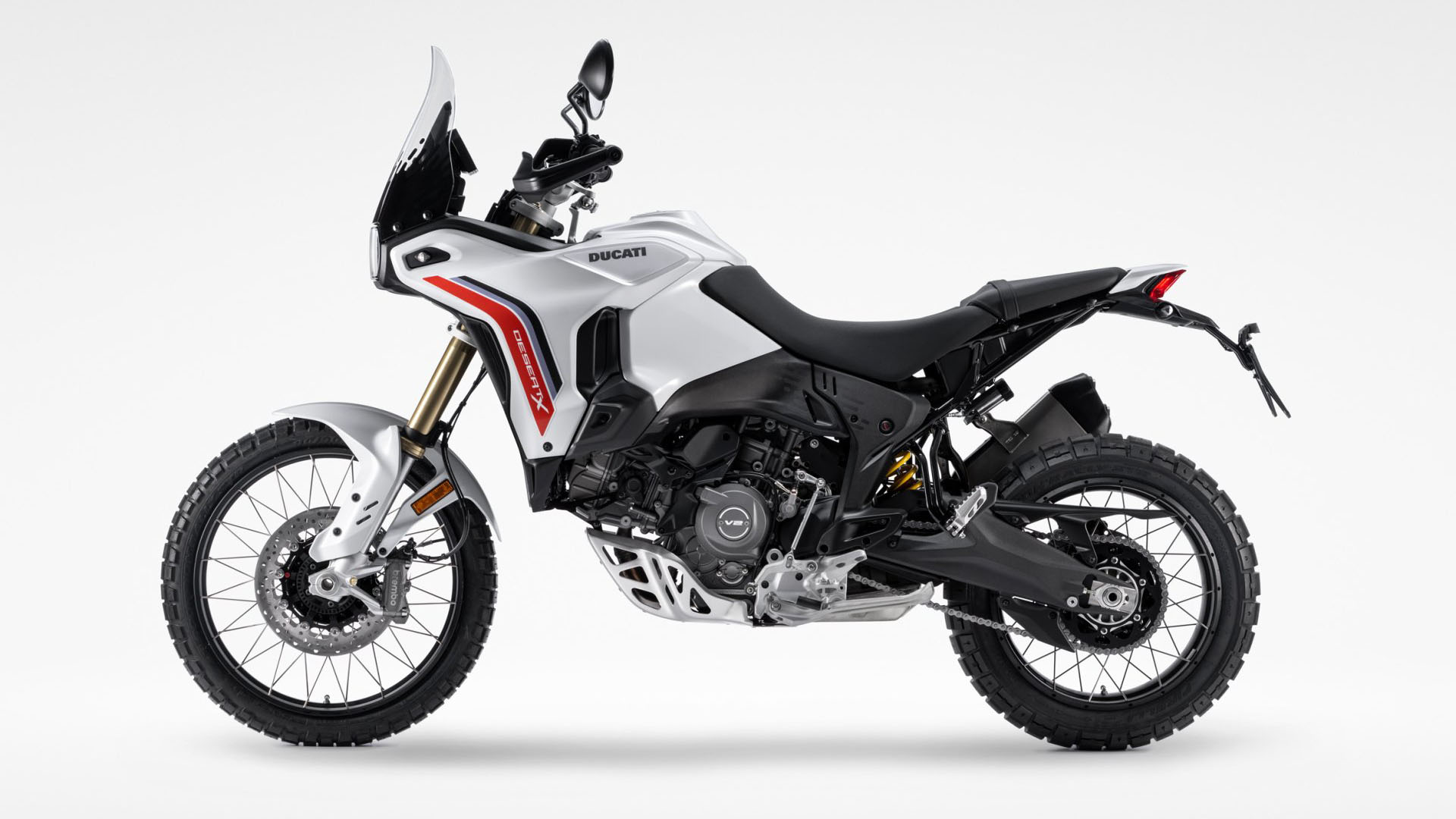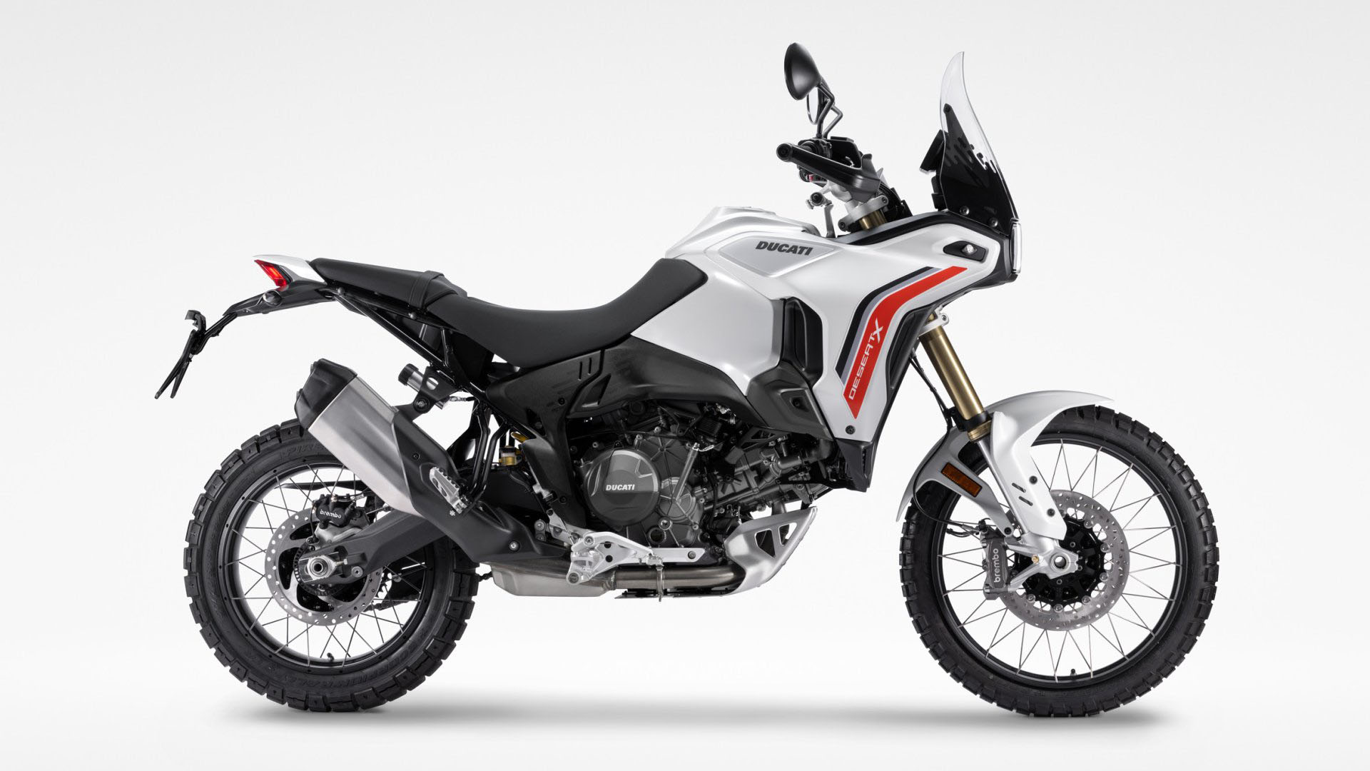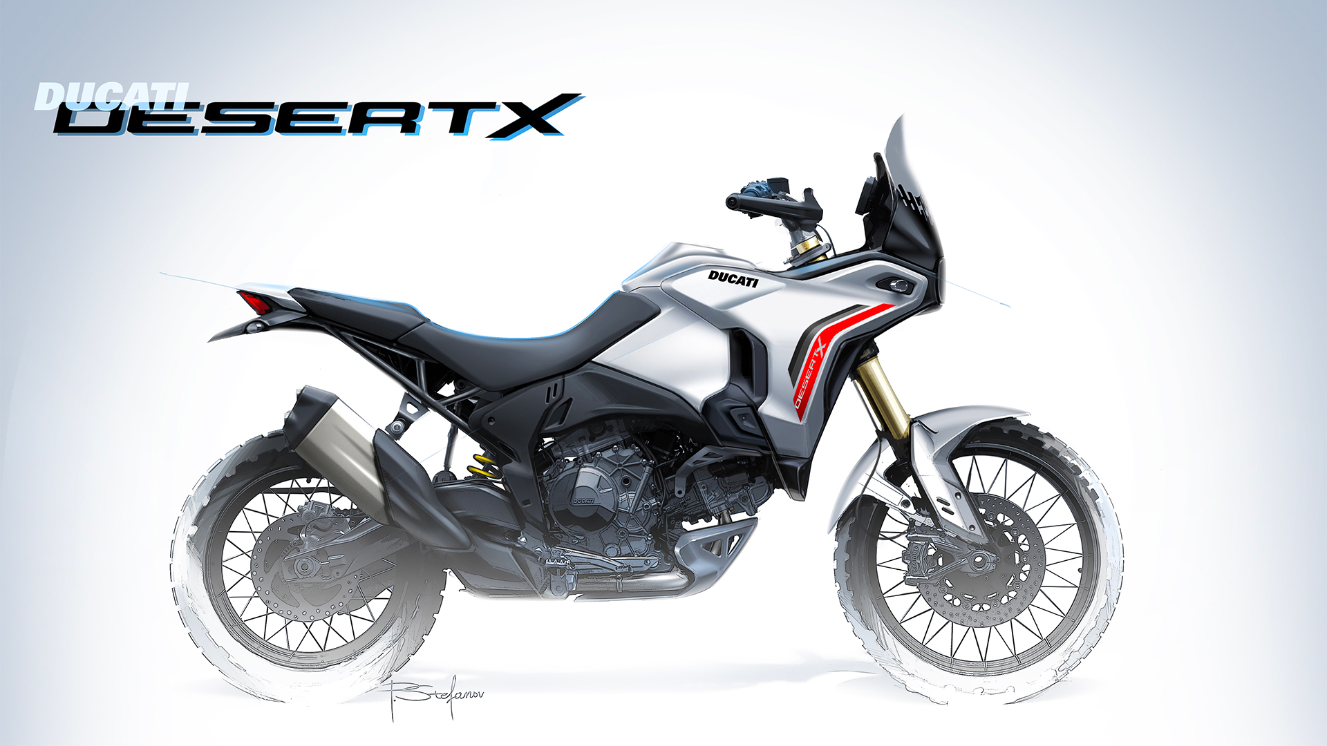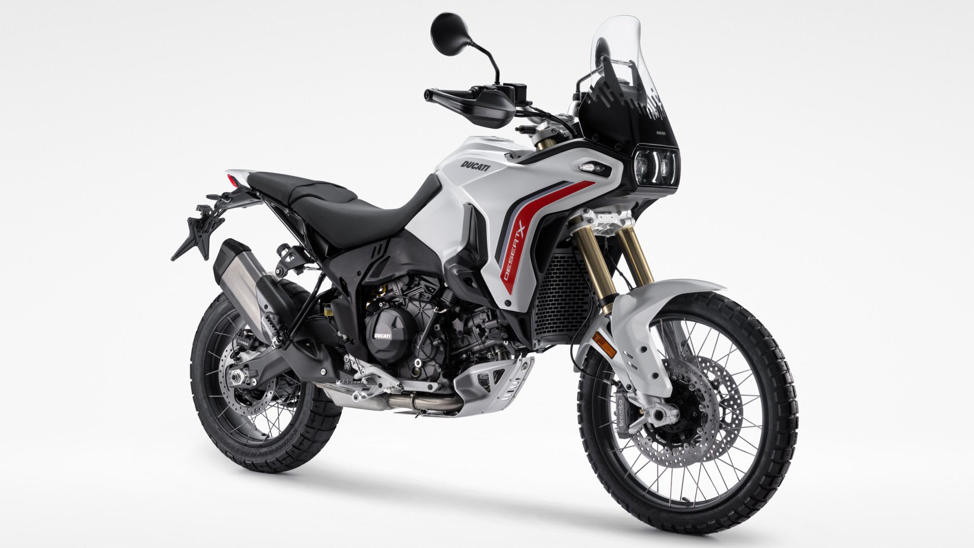 Με την πρώτη ματιά, η DesertX δείχνει πιο στιβαρή. Τα τεχνικά εξαρτήματα, όπως οι αναρτήσεις, οι βάσεις και τα προστατευτικά, αποκτούν πιο έντονο οπτικό ρόλο, ενώ τα πλαστικά μέρη έχουν περιοριστεί στο ελάχιστο για να δώσουν προτεραιότητα στη λειτουργικότητα. Το προφίλ της μοτοσυκλέτας είναι στενότερο και ψηλότερο στο πίσω μέρος, δημιουργώντας μια συνεκτική οπτική ισορροπία που επικοινωνεί αμέσως την ευελιξία και τις επιδόσεις. Το μπροστινό μέρος, χαμηλωμένο κατά 20 mm χωρίς να μειωθεί η διαδρομή της ανάρτησης, βελτιώνει την ορατότητα και αφήνει χώρο για τα όργανα πλοήγησης. Οι επιφάνειες του ρεζερβουάρ —χαμηλωμένες και ανασχεδιασμένες— καθιστούν τη μοτοσυκλέτα πιο compact, στενή και εύκολη στον χειρισμό.