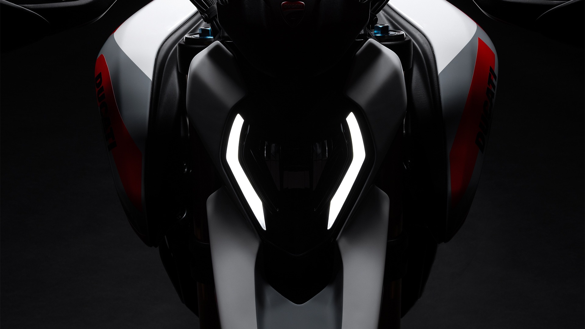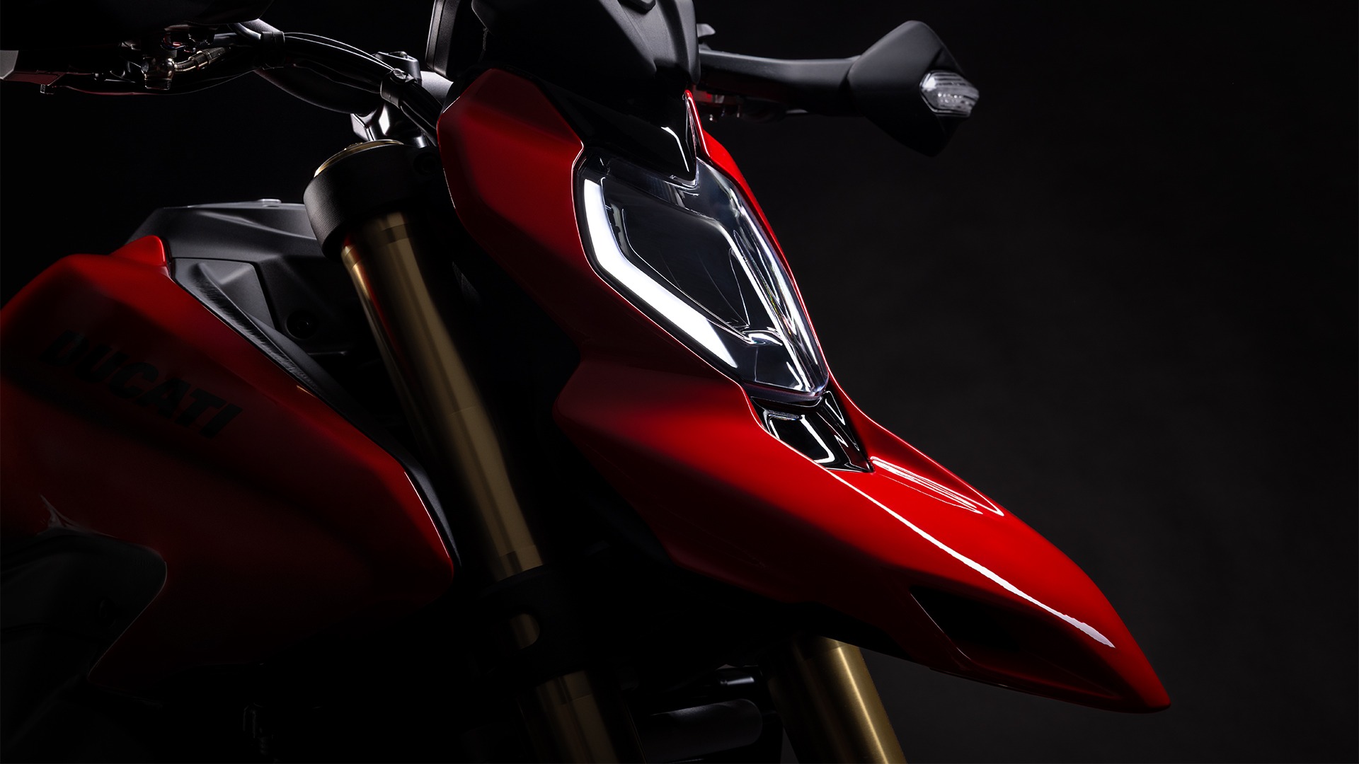 Η χαρακτηριστική υπογραφή της Hypermotard αποτελείται από δύο φώτα DRL, ενσωματωμένα σε έναν σκούρο, γυαλιστερό προβολέα που ενσωματώνεται άψογα στο κόκκινο μονοκόμματο μπροστινό τμήμα. Το αποτέλεσμα είναι μια μπροστινή όψη επιθετική, minimal και άμεσα αναγνωρίσιμη.