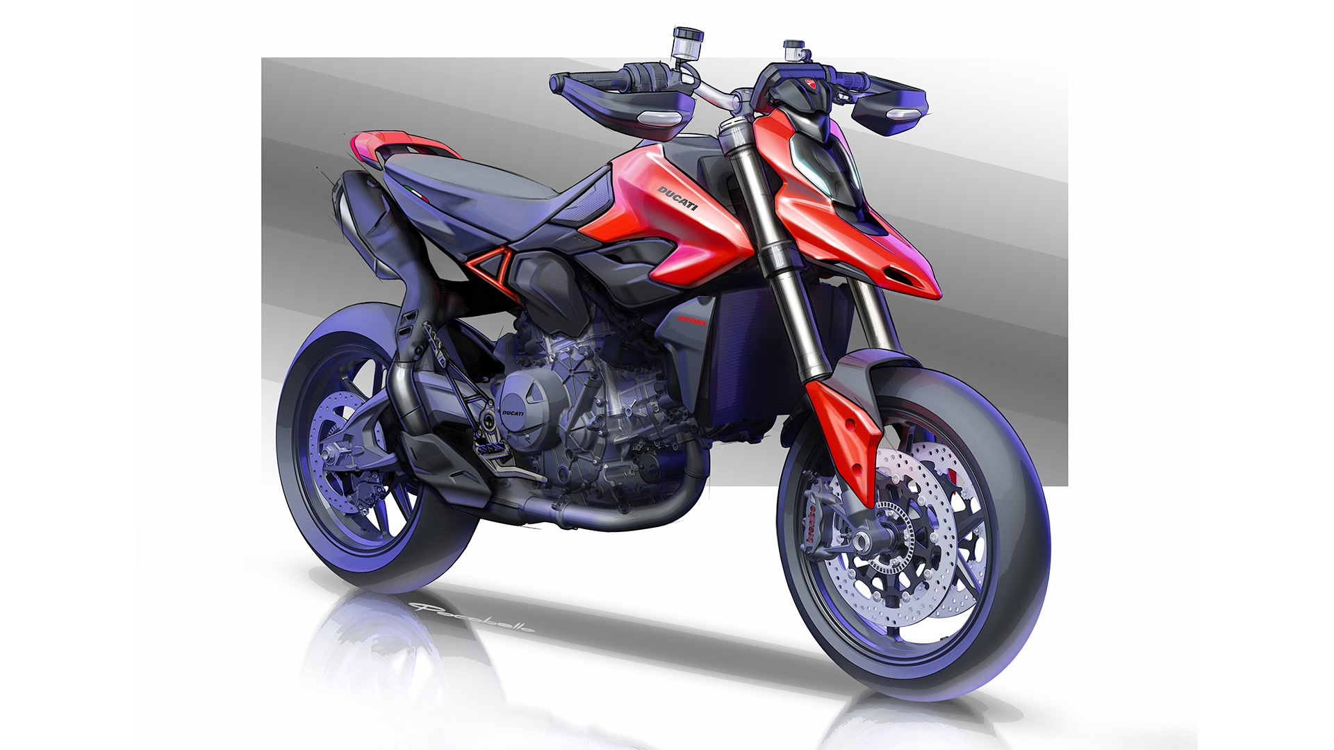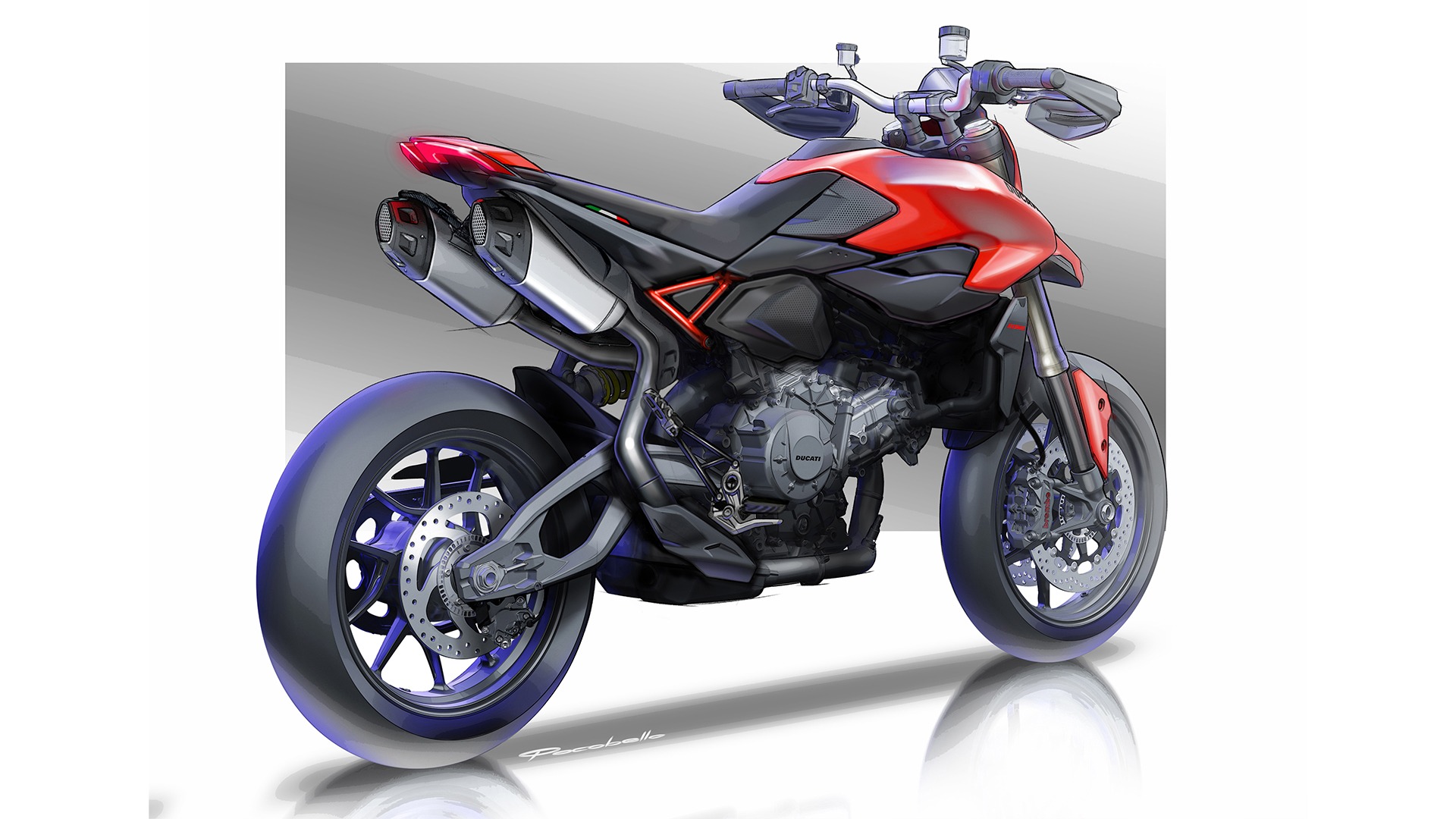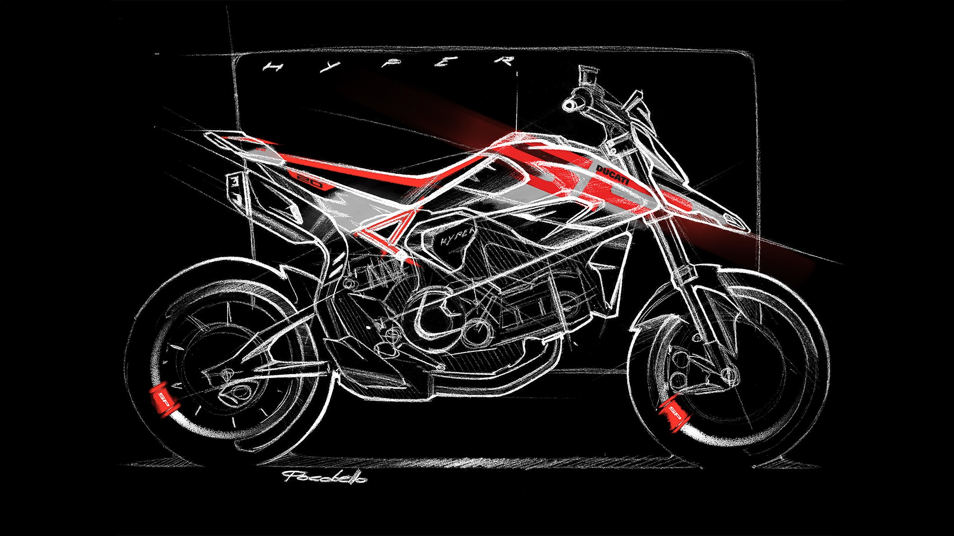 Εμπνευσμένη από το πρωτότυπο που εντυπωσίασε στην EICMA 2005, η νέα Hypermotard επαναφέρει και εξελίσσει τα σχεδιαστικά στοιχεία της Hypermotard 1100, τονίζοντας ακόμη περισσότερο τις τολμηρές αναλογίες και τις σμιλεμένες επιφάνειές της. Οι καθαρές, δυναμικές γραμμές συνδυάζονται με καλοδουλεμένους και σύγχρονους όγκους, διαμορφωμένους γύρω από μια εξαιρετικά compact μηχανική βάση, στην καρδιά της οποίας δεσπόζει ο νέος δικύλινδρος Ducati V2.