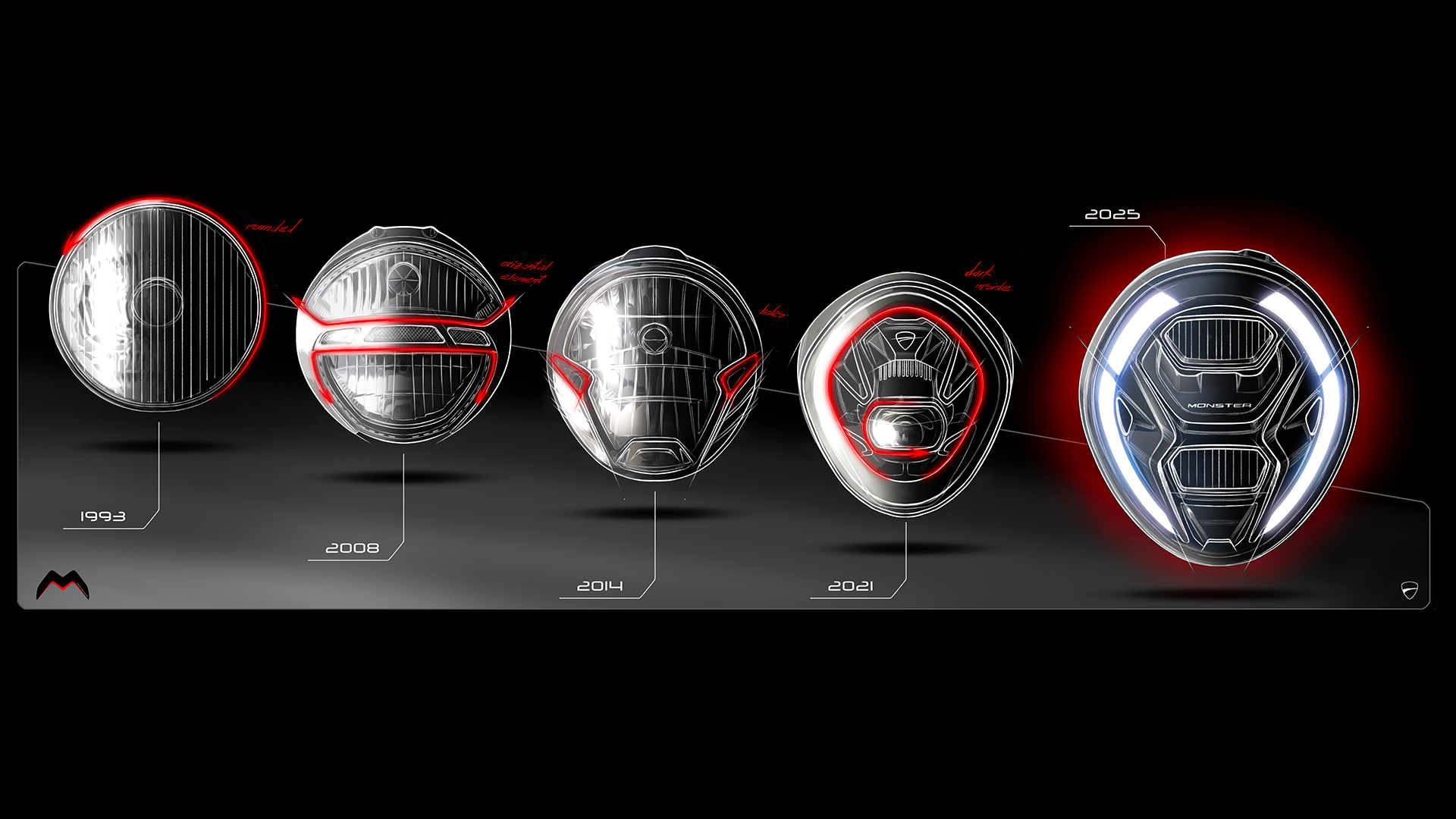 Ο νέος προβολέας διατηρεί το χαρακτηριστικό βλέμμα της Monster: σύγχρονο και “ρομποτικό”, με υπερ-συμπαγή σχεδίαση που διατηρεί το σύνολο της μοτοσυκλέτας κομψό και δυναμικό. Το διπλό σχήμα C, χαρακτηριστικό των naked της Ducati, αποδίδεται σε μια διχοτομημένη εκδοχή που θυμίζει τις γραμμές των supersport μοντέλων, αποτίοντας φόρο τιμής στην Panigale V4. Ένα στοιχείο που συνδυάζει λειτουργικότητα και αισθητική, αναδεικνύοντας τον σύγχρονο χαρακτήρα της μοτοσυκλέτας.
