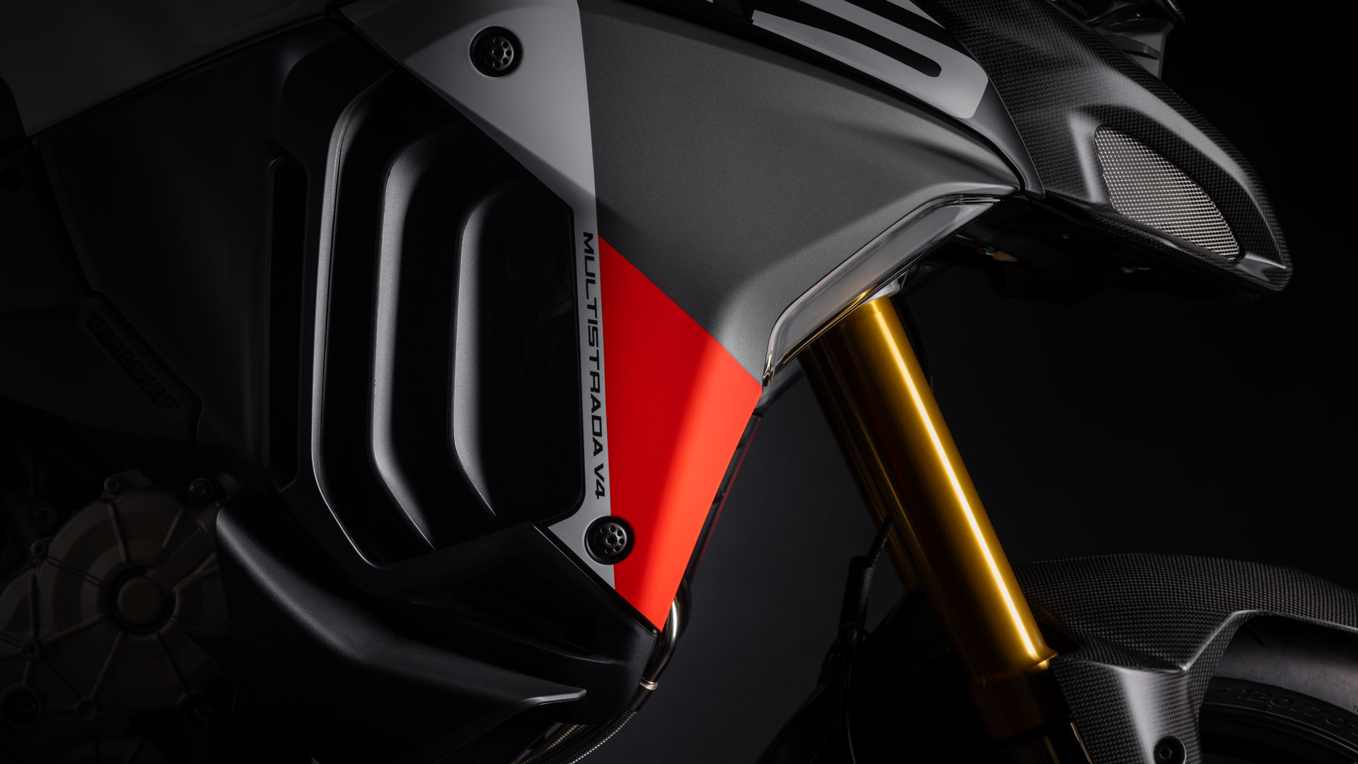 Στη Multistrada V4 RS, κάθε λεπτομέρεια έχει σχεδιαστεί με απόλυτη ακρίβεια ώστε να τραβά την προσοχή και να εντυπωσιάζει. Διάφορα τμήματα από ανθρακονήματα – όπως το εμπρός φτερό, τα προστατευτικά χεριών που έχουν σχεδιαστεί αποκλειστικά για αυτό το μοντέλο και το εμπρός «ράμφος» – δένουν αρμονικά με τον νέο σχεδιασμό RS και συμβάλλουν στη μείωση του συνολικού βάρους.
