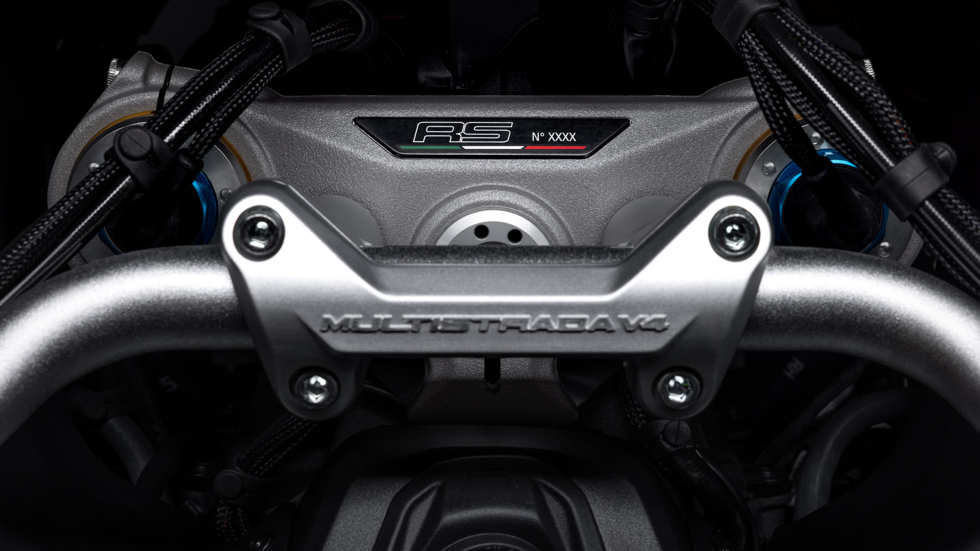 Σχεδιασμένη από το Centro Stile, ο σχεδιασμός της RS αποτελεί ένα βασικό στοιχείο αναγνώρισης αυτής της μοτοσυκλέτας. Εμφανίζεται τόσο στο κλειδί όσο και στα γραφικά του πίνακα οργάνων και συνδυάζεται ιδανικά με τα πιο χαρακτηριστικά γνωρίσματα των σπορ μοτοσυκλετών της Ducati. Ο μοναδικός αριθμός της σειράς βρίσκεται επάνω σε μια πλακέτα από μαύρο ανοδιωμένο αλουμίνιο, συνοδευόμενη από την ιταλική σημαία και τοποθετημένη στην τιμονόπλακα. Την εικόνα ολοκληρώνουν αποκλειστικές λεπτομέρειες σε Ducati red, όπως οι εμπρόσθιες δαγκάνες φρένων και τα αυτοκόλλητα των ζαντών, που παραπέμπουν στο πνεύμα της Panigale και προσφέρουν στη Multistrada V4 RS μια επιπλέον πινελιά σπορ χαρακτήρα και κομψότητας.