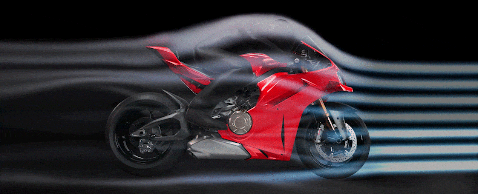 Περισσότεροι από δεκαοκτώ μήνες αεροδυναμικής εξέλιξης. Αμέτρητες αναλύσεις και εξέλιξη ρευστοδυναμικής CFD (Computational Fluid Dynamics). Όλα αυτά για να ενισχυθεί η ήδη εντυπωσιακή αεροδυναμική απόδοση της προηγούμενης Panigale V4. Ενέργειες που οδήγησαν σε μείωση της αντίστασης κύλισης κατά 4% με το ίδιο αεροδυναμικό φορτίο, καθώς και σε αύξηση της ροής αέρα προς το ψυγείο.